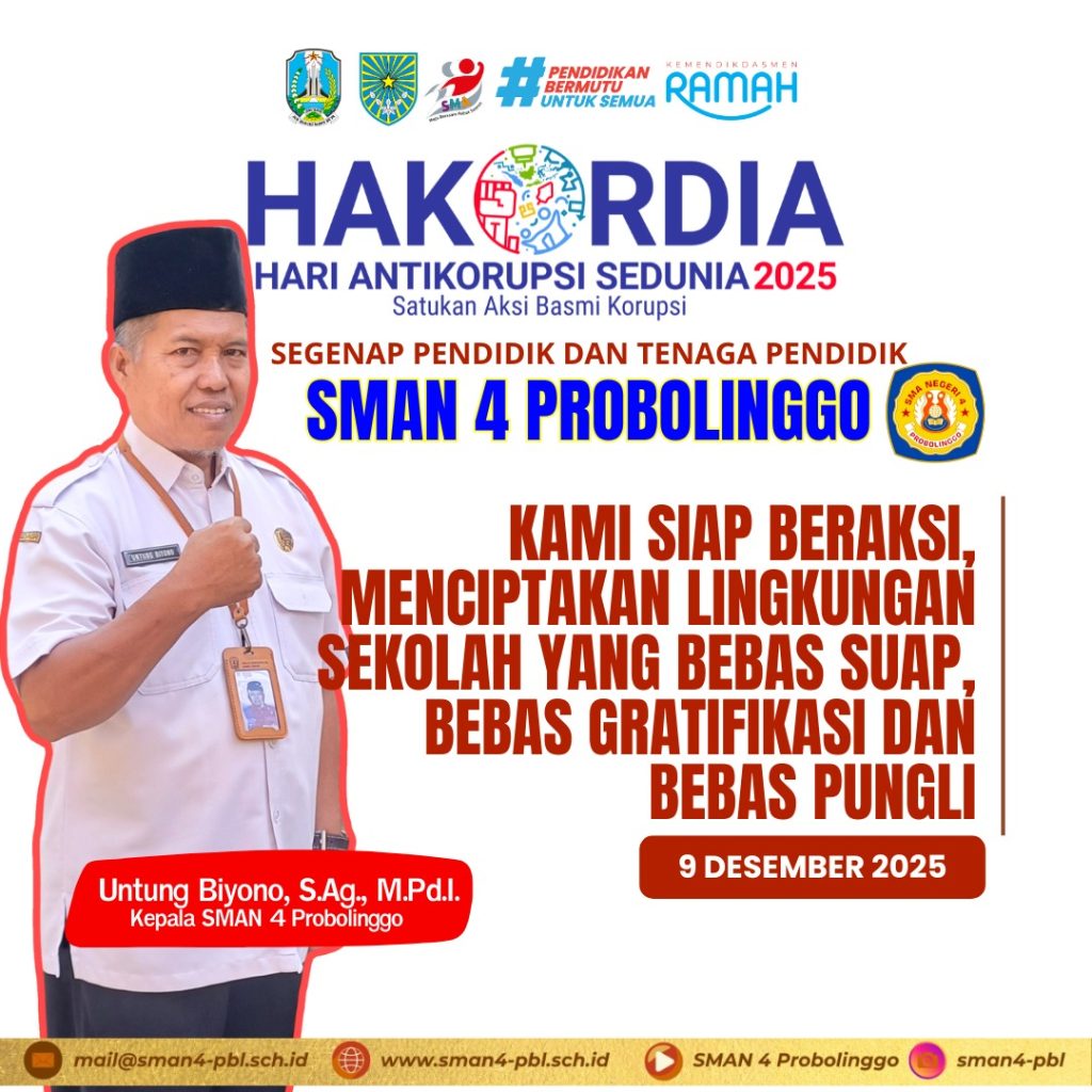 Hari Anti Korupsi Sedunia diperingati setiap tanggal 9 Desember sebagai bentuk komitmen bersama dalam upaya pencegahan dan pemberantasan korupsi. Peringatan ini bertujuan untuk menumbuhkan kesadaran akan bahaya korupsi serta menanamkan nilai-nilai kejujuran, integritas, dan tanggung jawab, khususnya di lingkungan pendidikan.