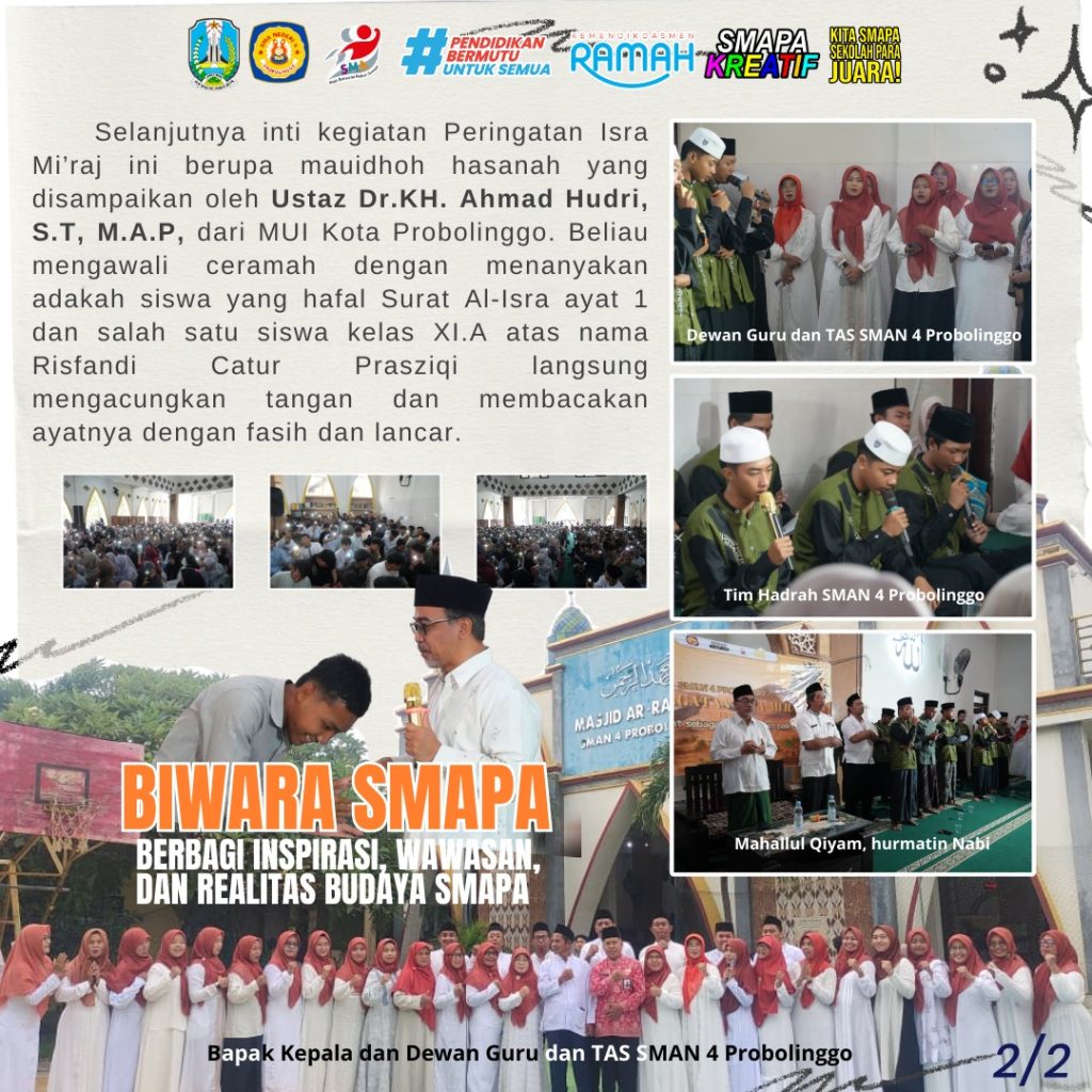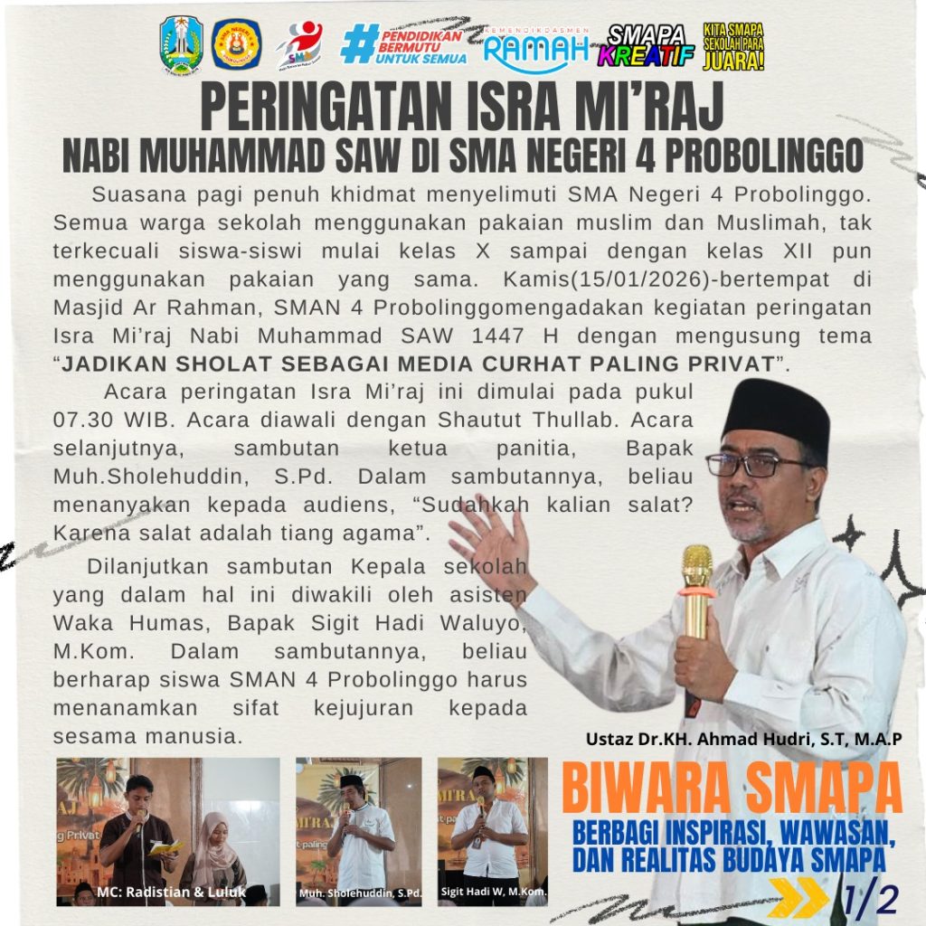 Isra Mi’raj merupakan peristiwa penting dalam sejarah Islam yang mengandung nilai-nilai keimanan, ketaqwaan, dan keteladanan Nabi Muhammad SAW. Dalam rangka meningkatkan pemahaman serta pengamalan ajaran agama Islam di lingkungan sekolah, SMA Negeri 4 Probolinggo menyelenggarakan kegiatan Peringatan Isra Mi’raj Nabi Muhammad SAW Tahun 2025 sebagai sarana pembinaan karakter religius peserta didik
