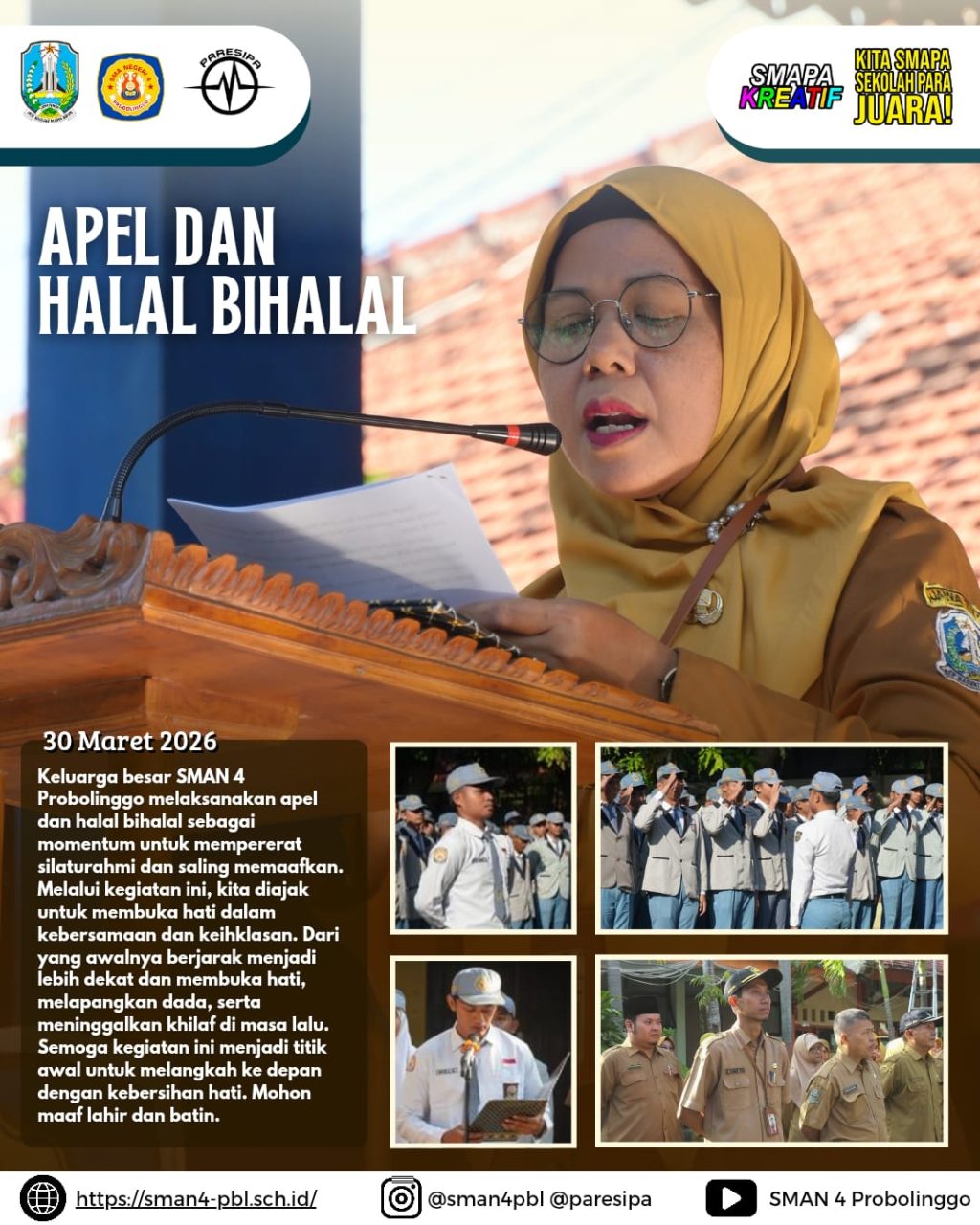 Dalam suasana penuh kebersamaan dan keberkahan Hari Raya Idul Fitri 1447 H, keluarga besar SMA Negeri 4 Probolinggo mengucapkan Minal Aidin Wal Faizin, mohon maaf lahir dan batin. Semoga melalui kegiatan Halal bi Halal ini semakin mempererat tali silaturahmi, memperkuat rasa persaudaraan, serta menumbuhkan semangat kebersamaan antara guru, staf, dan seluruh siswa SMAN 4 Probolinggo. Mari kita jadikan momentum ini untuk saling memaafkan dan menjadi pribadi yang lebih baik.